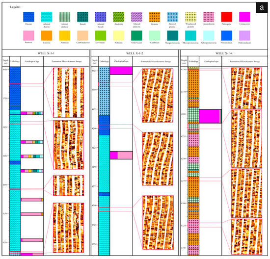 To further analyze the control effect of geological tectonic movements on hydrothermal alteration in different geological periods, the tectonic schists with significantly different geological periods such as Well X-1-2 and the 3800–4000 m in Well X-1-1 were discussed separately, and compared with the diabase of Well X-1-4 and the andesite with complexer material sources in X-2-1 well (Figure 8). The results indicate that multiple hydrothermal alterations have occurred in the study area, and there are differences in the alteration characteristics of different geological ages.