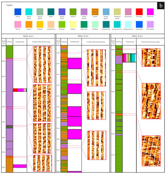 Both X-1 and X-2 well areas expose diverse igneous rocks spanning mafic to felsic compositions. The X-1 well area primarily contains diorite (Figure 7a), while the X-2 well area hosts andesite (Figure 7b). Weathered granite occurs in Well X-1-4; compared to altered granite in adjacent wells, FMIs reveal more dissolution fractures in this unit. Altered rocks in these wells develop more extensive fracture networks than their unaltered counterparts. Unaltered basalt and granite particularly lack fractures or show minimal fracturing. This fracture–alteration correlation underscores tectonic activity’s pivotal role in driving alteration processes. Faulting generates fractures, increasing rock susceptibility to alteration by enabling deeper hydrothermal fluid penetration. The similar alteration patterns observed in diorite and andesite and the similar depths they are situated at may suggest that these two rock types could have experienced the same geological event during the Jurassic–Cretaceous. The fracture openings and fracture porosity in the tectonic schist are relatively large, aligning with the observed increase in permeability. The porosity of the altered andesite changes slightly compared to unaltered andesite, but the permeability of the altered andesite notably increases, likely due to the fractures. Additionally, multiple fracture types are overserved in granite and diorite. Given that continuous fractures are of tectonic origin, it suggests that the same lithology in the study area may have undergone various episodes of tectonic events.
