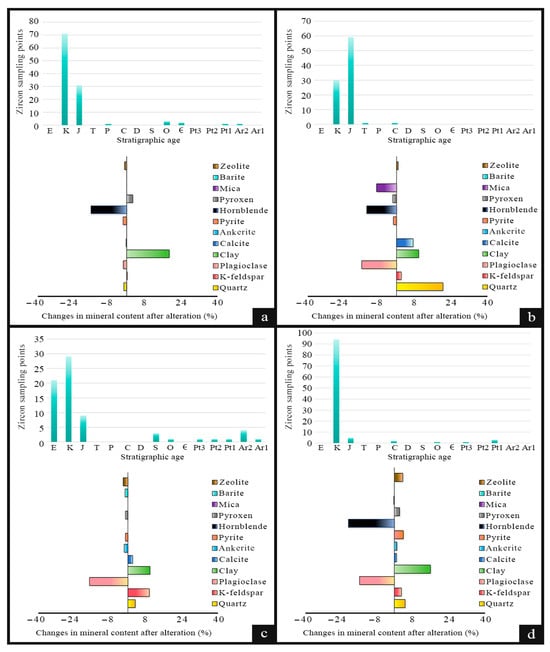 Comparison of altered minerals changes in different geological ages (N is Neogene; E is Paleogene; K is Cretaceous; J is Jurassic; T is Triassic; P is Permian; C is Carboniferous; D is Devonian; S is Silurian; O is Ordovician; ∈ is Cambrian; Pt3 is Neoproterozoic; Pt2 is Mesoproterozoic; Pt1 is Paleoproterozoic; Ar2 is Neoarchean; Ar1 is Paleoarchean): (a) the tectonic schist at the 3800–4000 m in Well X-1-1; (b) the tectonic schist in Well X-1-2; (c) the andesite in the Well X-2-1; (d) the diabase in the Well X-1-4.