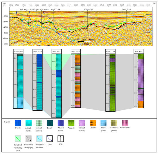 The tectonic movement in the research area is very complex, multiple pronounced faults are developed near the Wells X-1-1, X-1-2, and X-1-3 (Figure 9). Previous studies on the Mesozoic Paleo Tethys Plate and the ancient Pacific Plate, as well as multi-scale analysis conducted in this study, indicate that Huizhou Depression in the northern South China Sea experienced multiple episodes of tectonic activities and subsequent alteration, resulting in the complex buried hills’ structure depicted in Figure 9. To analyze the complex alteration mechanism in the study area, this paper proposes a four stage alteration model and conducts a detailed analysis and summary based on geological history.