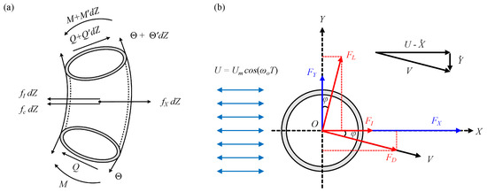 In the analysis of an infinitesimally small element with length , as illustrated in Figure 2a, we perform a force analysis for this very element, focusing on the X-direction as an example. The element experiences several forces: the damping force , the inertia force , the external fluid force , the shear force Q, the axial tension , and the bending moment M. Under these conditions, the element must satisfy both force and moment equilibrium. Based on this analysis, the governing equations for the vibrations of the riser in the IL and CF directions can be derived: