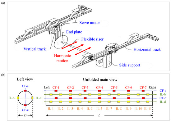Ren et al. [12,13] experimentally investigated the VIV characteristics of a flexible cylinder under uniform oscillatory flow in the ocean basin at Shanghai Jiao Tong University. Sketches of the experimental apparatus and the instrumentation of the fiber Bragg grating (FBG) strain sensors along the flexible cylinder model are presented in Figure 3. As shown in Figure 3a, both ends of the flexible cylinder were connected to the supporting frame mounted on two horizontal tracks and the supporting frame underwent periodic motion to simulate the uniform oscillatory flow around the cylinder. In their experiments, as depicted in Figure 3b, four sets of FBG strain sensors were glued to the surface of the flexible cylinder to measure the IL and CF strains with eleven and seven measurement points along the model, respectively.