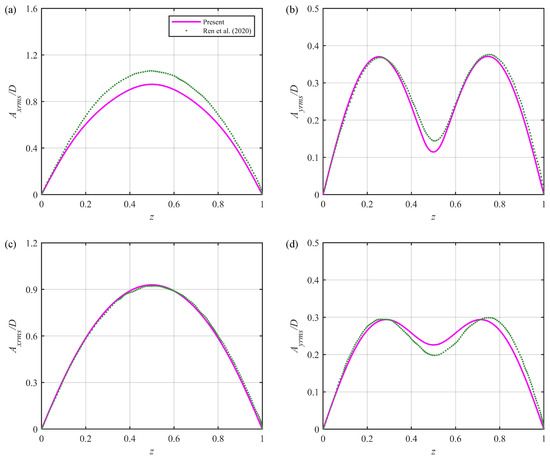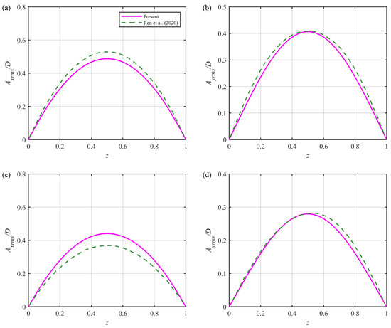 Comparisons of root mean square displacement amplitudes along riser () with experimental data in Ren et al. [13]: (a) in-line root mean square amplitudes for Case C; (b) cross-flow root mean square amplitudes for Case C; (c) in-line root mean square amplitudes for Case D; and (d) cross-flow root mean square amplitudes for Case D.