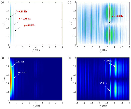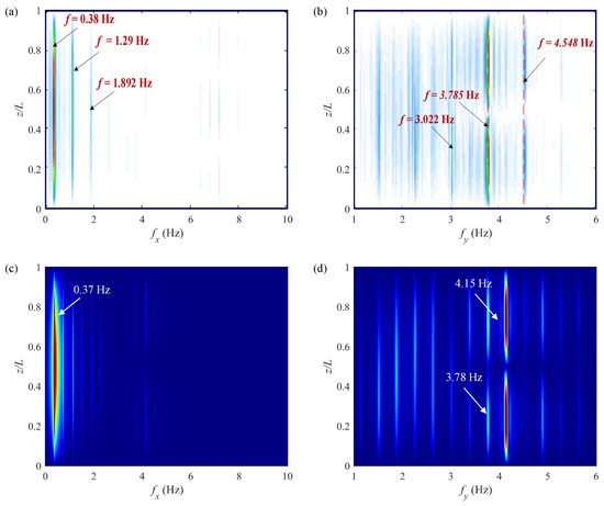 Figure 6 and Figure 7 present a comparative analysis of the spatial distributions of the response frequencies with the experimental data reported in Ren et al. [13] for Cases C and D. It is evident that in the two cases, the dominant frequencies of the IL VIV observed in the experiment are 0.38 Hz and 0.18 Hz, respectively, while, the predicted IL dominant frequencies are, respectively, 0.37 Hz and 0.17 Hz, demonstrating quantitative agreement with the experimental measurements. Regarding the CF VIV response, the dominant frequency for Case C is 3.785 Hz, whereas the predicted CF dominant frequency is marginally higher at 4.15 Hz, with the frequency component of 3.78 Hz also identified. Similarly, for Case D, the predicted CF dominant frequency of 4.09 Hz slightly exceeds the experimental value of 3.68 Hz. Furthermore, the multi-frequency characteristics observed in the experiment are effectively reproduced by the present model.