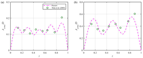 Comparisons of root mean square displacement amplitudes along riser () with experimental data in Trim et al. [37]: (a) in-line root mean square amplitudes; (b) cross-flow root mean square amplitudes.