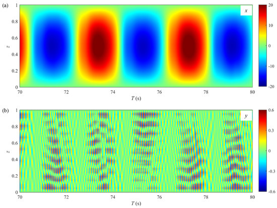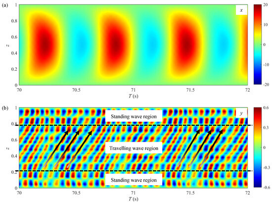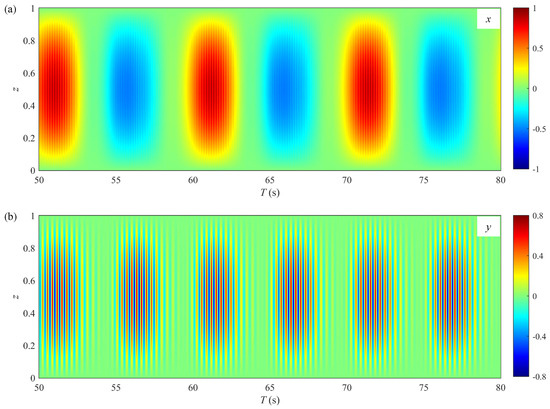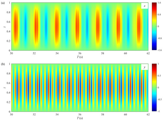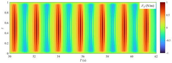 Furthermore, as shown in panel (b) of Figure 9, Figure 10, Figure 11 and Figure 12, the period of the IL displacement response closely aligns with . Figure 13 displays the spatial–temporal evolutions of the IL fluid force for Case A, which is primarily driven by the uniform oscillatory flow. Consequently, the strong similarity between the displacement period and the flow period results from the two-way coupling between the force and the structural response [22]. In addition, the high-frequency components of the IL displacement responses in Cases A and C are more pronounced than those in Cases B and D. This observation suggests that higher numbers diminish the effects of the VIV on the IL vibration. This phenomenon may be explained by the longer oscillatory flow periods at high numbers, which help stabilize the vortex motion.