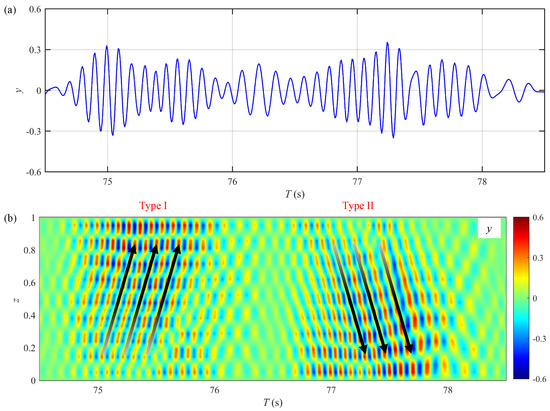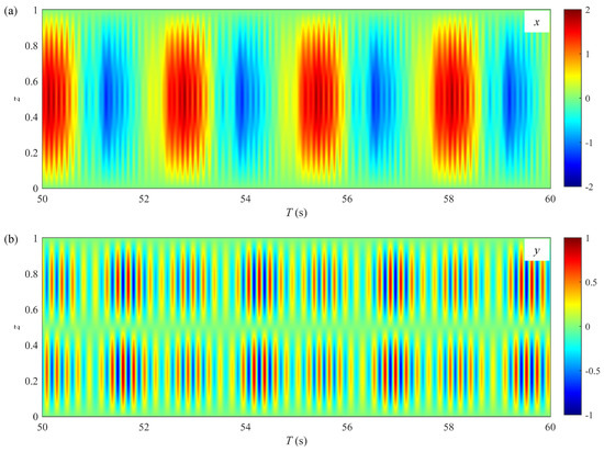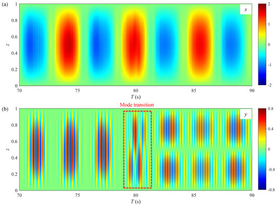 Figure 9 and Figure 10 illustrate the spatial–temporal evolutions of the IL and CF VIV displacements for Cases A and B, respectively. In both cases, the displacement responses in the IL and CF directions are predominantly influenced by the first mode over time, exhibiting clear characteristics of standing waves. However, in Case B, a significant modulation phenomenon is observed in the CF response, which is not present in Case A.