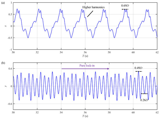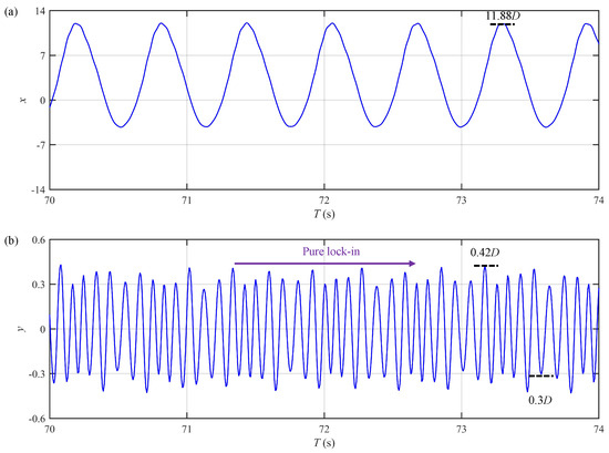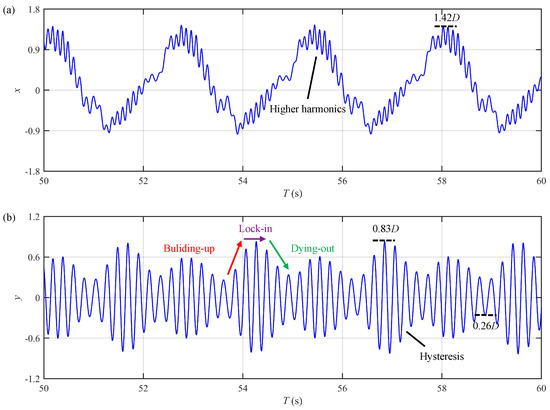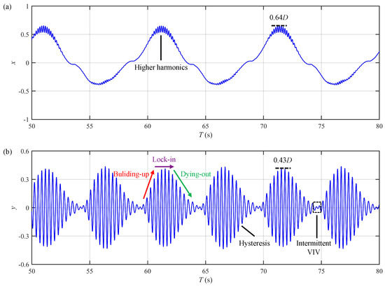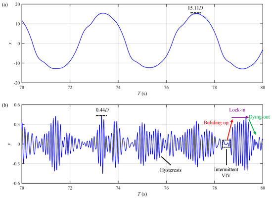 Displacement time histories at for Case F (): (a) in-line displacement; (b) cross-flow displacement.
