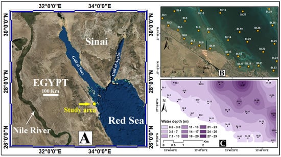 (A) Regional Google Earth map for the Hurghada site, (B) Google Earth map for the sampled stations in the investigated site, and (C) Spatial distribution map for the water depth ranges of the investigated stations.
