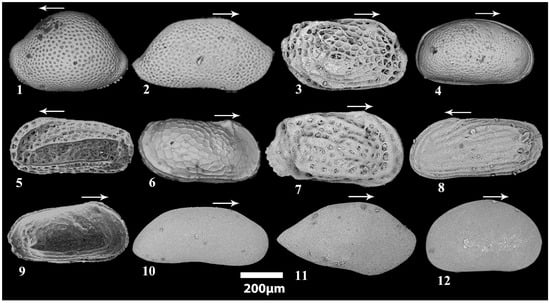 - Brasier, M. Phylum Crustacea. Ostracods. In Microfossils; Armstrong, H., Brasier, M., Eds.; Wiley-Blackwell Publishing: Hoboken, NJ, USA, 1979; pp. 219–248. [Google Scholar]