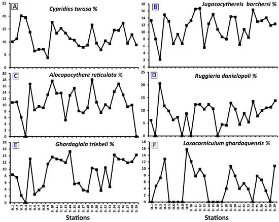 Distribution pattern for the relative abundance of the six most dominant ostracod species: Cypridies torosa (A), Jugosocythereis borchersi (B), Alocopocythere reticulata (C), Ruggieria danielopoli (D), Ghardaglaia triebeli (E), and Loxocorniculum ghardaquensis (F).