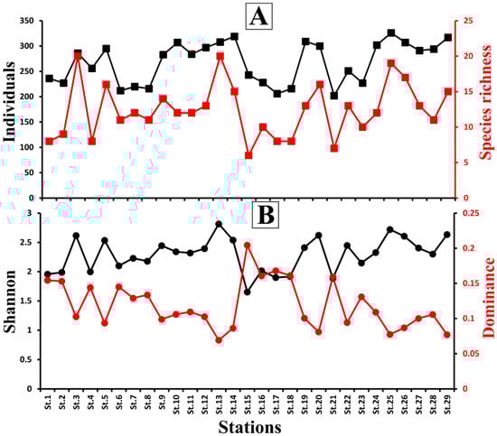 (A) Species richness and individuals (number of the counted individuals per 20 g/dry weight) of the total living ostracod assemblages retrieved from the studied stations. (B) Diversity indices (Shannon and Dominance) for the total living ostracod assemblages in the investigated stations.