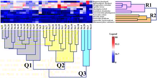 Hierarchical cluster analysis dendrograms of the benthic ostracod >2% based on R- and Q modes using Bray–Curtis similarity index. Note: Q1 denotes offshore stations; Q2 represents the highest pollution levels dominated by ostracod taxa occupied by R1, and Q1 encompasses sandy-dominated stations.