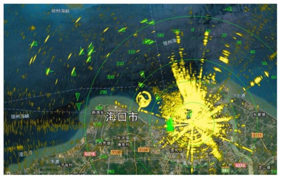 The maritime surveillance system deployed in the Qiongzhou Strait. The yellow part in the figure represents the detected targets. The green triangle represents the AIS information of the ship. There are many unverified targets in the figure.