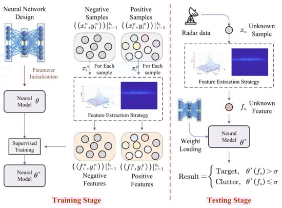 As researchers delve into the potential of deep learning for radar target detection [11,13,14,25,26,27], they recognize both its promise and its challenges. The paradigm of these methods is shown in Figure 2. Deep networks are capable of automatically learning and extracting meaningful features from complex datasets, allowing for improved differentiation between sea clutter and marine targets. However, a significant limitation of these approaches is their heavy reliance on the distribution of training samples. In practical applications, variations in the operational environment can lead to discrepancies in training data, potentially constraining the generalization performance of deep-learning models. Consequently, achieving reliable performance in real-world systems necessitates further investigation into strategies that enhance the robustness and adaptability of deep network-based detection methods, ensuring they can effectively navigate the unpredictability of maritime settings.