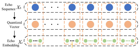 where p denotes pulse (slow time) dimension and r denotes range (fast time) dimension. We performed average pooling on X using a window size of b. This resulted in transforming into . For each data point in , we quantized it using k bits, which means we fixed the value of each point to an integer in the range . In this step, we aim to reduce the data dimensionality for better computational efficiency and to simplify subsequent analysis. We constructed an embedding look-up matrix for the sampled points of the radar echoes. d is the embedding size and the value is consistent with the quantization range. Similar to the basic idea of word embedding [32], each sample point is encoded using the embedding matrix. Finally, we obtain the echo embedding . Taking a single pulse as an example, encoding is performed in the range dimension, and the encoding process is shown in Figure 4. After encoding, each sampled point can be represented by a d-dimensional vector.