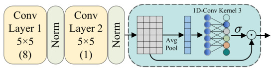 where represents the average pooling operation, represents the feature index, k denotes the pooling window size, and s denotes the stripe size. Then, the input is passed through a 1D convolutional layer and a Sigmoid activation function layer to obtain the attention weight coefficients: