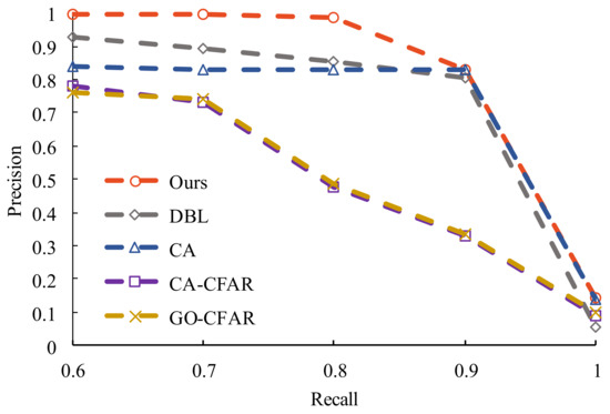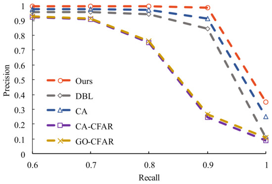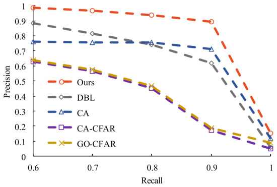 To further evaluate the detection performance of our method, we adjusted the classification threshold of the detection model and plotted the precision–recall curve as shown in Figure 8, Figure 9 and Figure 10. We believe that in practical application scenarios, it is challenging to calculate the false alarm rate because we have difficulty determining the exact number of “negative samples”. We can only know how many targets the detection algorithm currently detects and then confirm how many are true targets and how many are false targets. Therefore, we believe that compared to other methods, the precision–recall curve is a more suitable evaluation metric for assessing the performance of radar target-detection algorithms.