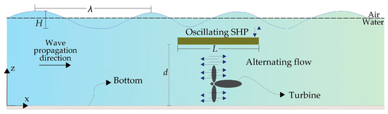 Schematic representation of the SHP device indicating wave parameters (wavelength λ and height H), structure length (L), and clearance (d) between the SHP and the seabed.