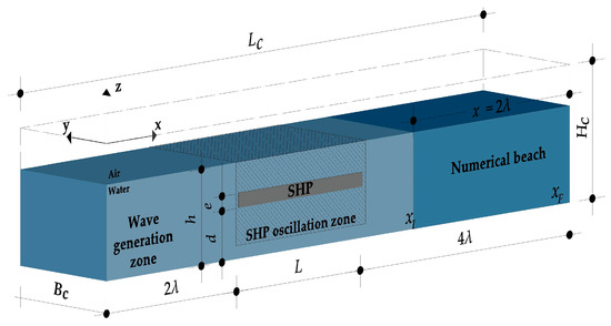 The device and the wave parameters adopted for the SHP-NO configuration are based on the original experimental setup [20]. In the tests, regular waves were used with heights of H = 0.06 m and H = 0.10 m, and wavelengths λ of 3.46 m, 5.37 m, and 6.68 m. For the SHP-O configuration, a rigid SHP is modeled; however, vertical motion along the z-axis may occur as a result of the imposed boundary conditions.