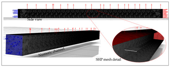 For the SHP-O model, the setup followed Case 1, placing the device at the channel’s center and submerging it to a depth of 1 m, as shown in Figure 5.