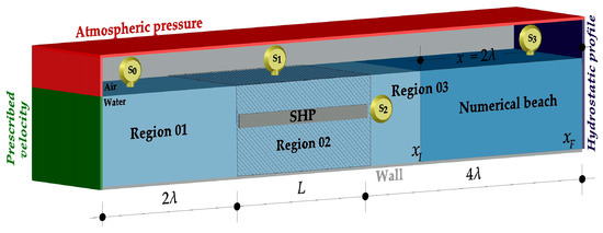 The computational domain was segmented into three distinct regions: Region 01 for wave generation (2λ), Region 02 containing the SHP device (variable length L), and Region 03 at the downstream end of the NWT (4λ), which includes the numerical beach from to (2λ). To collect the data needed for calculating the theoretical efficiency ϕ of the SHP-O, four numerical probes ( to ) were installed (see Figure 6).