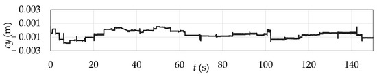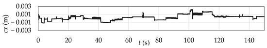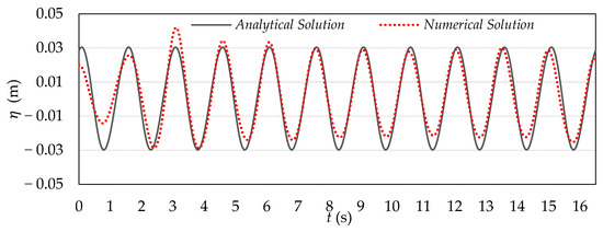 The verification procedure of the numerical wave model began with the setup, in the 3D NWT, of a scenario involving the propagation of regular waves through the channel, without the inclusion of the SHP. For this stage, parameters defined in the reference study [20] were applied: H = 0.06 m, λ = 3.46 m, h = 0.60 m, and T = 1.5 s. Measurements from probe , shown in Figure 6, are presented in Figure 7, along with the comparison to the time series analytically obtained using Equation (9).