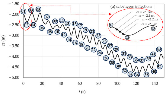 The behavior of the SHP-O under wave action was characterized through hydrodynamic parameters considered in the formulation of Equations (24) and (25). The static pressure (p) exerted on the structure was recorded based on its oscillatory motion, with measurements referenced to the center of gravity. The dynamic pressure component was calculated using the expression (ρu2/2), where u is the flow velocity beneath the device. This velocity was measured with the aid of the linear monitoring sensor . Other relevant variables include the wave period (T), time (t), the submersion depth of the SHP-O (d), total water depth (h), and the width of the device ().