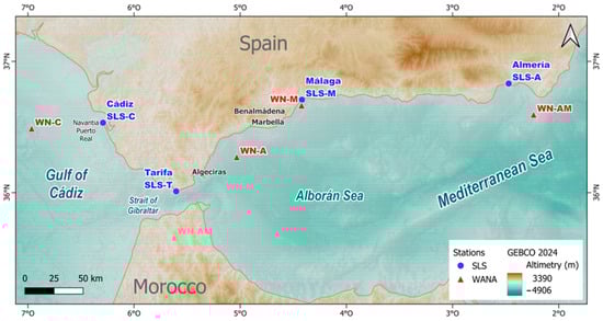 Study area: Gulf of Cádiz and Alborán Sea with sea level stations and WANA nodes. The background is the General Bathymetric Chart of the Oceans (GEBCO), 2024, in world Mercator projection.