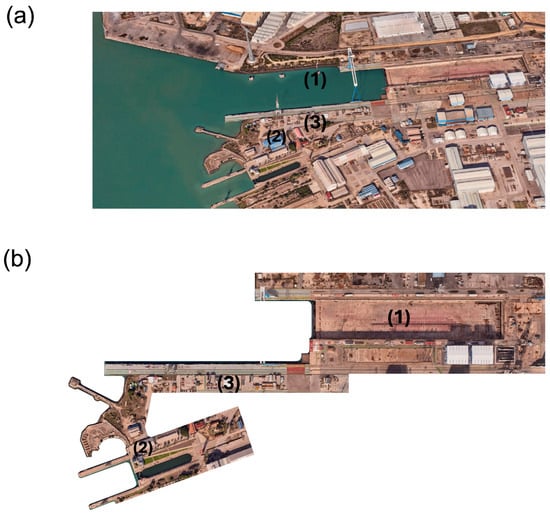 Figure 3a shows a modified panoramic Google Maps image highlighting (1) the 500 m long and 100 m wide dry dock equipped with two heavy-duty overhead cranes of 190 m in height; (2) the historical area containing the oldest facilities, including a museum that preserves valuable cultural and industrial heritage; and (3) the auxiliary workshops located along the dock. Figure 3b presents the plan view of the shipyard.
