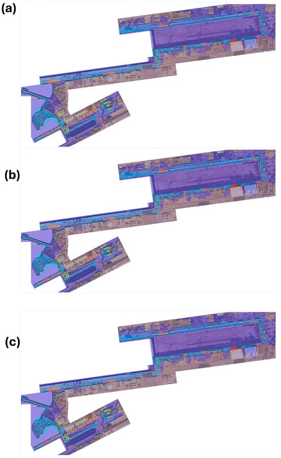 Predicted flooded areas in the Navantia Puerto Real shipyard for return periods of (a) 10 years, (b) 25 years, and (c) 75 years.