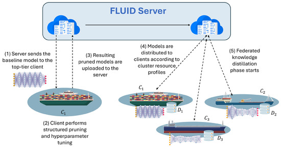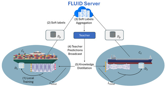 To address these challenges, we propose FLUID, a novel, communication-efficient FL framework that supports heterogeneity in both models and system resources (i.e., model and system agnostic). FLUID replaces weight sharing with a student–teacher knowledge distillation mechanism, allowing clients to learn from compact logit representations instead of full model parameters [17,18]. This decouples the global model structure from client architectures, enabling each vessel to use models tailored to its local constraints without sacrificing global performance [19,20,21].