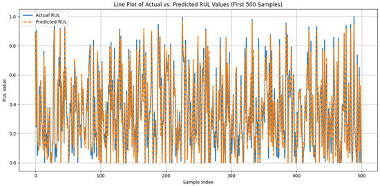 CML-trained baseline models predictive performance analysis against the actual RUL values for the first 500 samples.