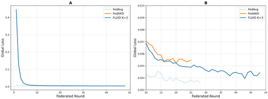The remaining data were then normalized (min–max) to a range of [0, 1] to ensure that the magnitude of the value did not influence their importance. Finally, for the CML training scenario, the dataset was split into 80% training, 10% testing, and 10% validation. In the FL experiments, data splitting varied by method. For FedAvg, the dataset was evenly divided among four clients, while for both FLUID and FedAKD, 90% of the data were distributed equally across the clients (i.e., following again the 80/10/10 ratio for the local training), while the remaining 10% were allocated to the teacher model.