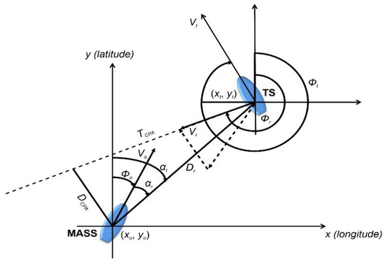 where is the relative distance between the MASS and the TS, is the relative velocity, is the relative course, is the azimuth of the TS, and is the relative bearing. is the time to the CPA, and is the distance between the MASS and the TS at that time.