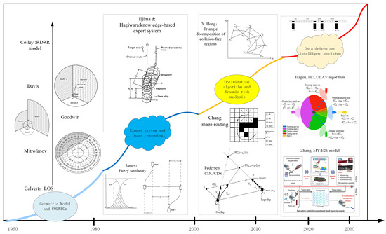 The incorporating behavior prediction methods takes the COLREGs as the core framework, and combines geometric modeling, expert systems and fuzzy logic and other technologies to build a collision avoidance decision-making logic that conforms to the norms of nautical practice [2]. Its development history can be traced back to the 1960s. Early research was dominated by geometric models and rule-based methods, and then expert systems and fuzzy reasoning techniques were gradually integrated to form an interpretable and standardized collision avoidance strategy system. Figure 2 shows the evolution of research related to regulation-driven approaches. Early incorporating of behavior prediction methods was performed to analyze the ship’s motion trajectory through geometric relationships and generate evasive maneuvers in conjunction with COLREGs provisions. Ship Domain is the core concept for collision risk assessment, and its development is closely related to COLREGs. In 1971, Fujii and Tanaka [13] firstly proposed an ellipsoidal ship domain centered on the ship based on the traffic study of the Japanese waterways, which defines the safe space range that the crew needs to maintain, and became the cornerstone of subsequent studies [14,15,16]. In 1975, Goodwin further discretized the ship domain into three dynamic zones, give way zone, straight ahead zone, and pursuit zone, which correspond to the collision avoidance responsibilities under different encounter scenarios [17]. The radius of a ship’s domain is affected by a variety of factors, including the type of water, traffic density, vessel size and speed, and its dynamic adjustment characteristics make it a key basis for collision risk assessment. The concept is still an important theoretical basis for the design of nautical safety and autonomous collision avoidance algorithms [18,19,20,21]. With the development of computer technology, expert systems and fuzzy logic have been introduced into collision avoidance decision-making, which enhances the adaptability and flexibility of regulation-driven.