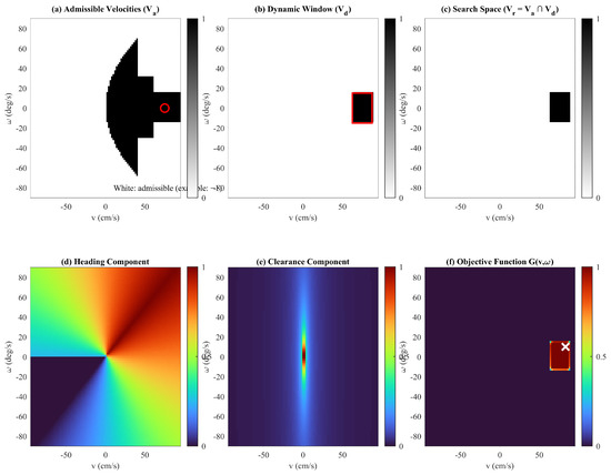 The main principle of the dynamic window algorithm. (a) Feasible speed area via obstacle position and braking distance (gray = feasible, black = infeasible, current speed marked). The red circle represents the current speed status of the robot. (b) The robot’s reachable speed range; dynamic window in red rectangle (center = current speed). (c) Effective search space from feasible/reachable speed intersection (white = safe/reachable speeds). (d) Heading alignment (color = scores); (e) obstacle clearance (color = distance scores). (f) Combined objective function G (color = values); red cross rectangle marks optimal velocity (global max).