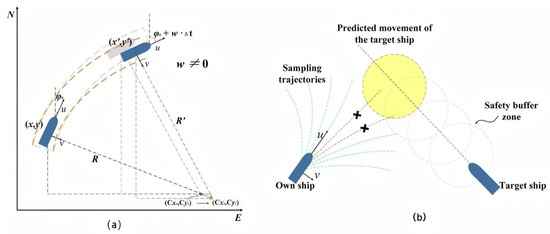 The schematic diagram of the revised DWA for MASS. (a) Assumption of MASS for circular motion. (b) Extended DWA with collision avoidance prediction [27]. Reproduced with permission from [27].