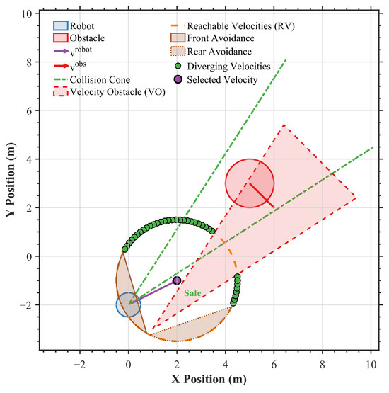 In order to realize collision-free and oscillation-free navigation of multi-mobile robots or virtual agents, Ref. [30] proposes a Hybrid Reciprocal Velocity Obstacle (HRVO) method for the realization of collision-free and oscillation-free navigation of multi-mobile robots or virtual agents. HRVO, based on RVO, expands the obstacle boundaries on the “wrong” side of the passage according to the current velocity position. When a robot selects the “wrong” side, it must completely avoid the obstacle; when it chooses the “right” side, reciprocity is maintained, thereby avoiding the “reciprocal dance” oscillation. This method predicts the trajectories of other robots by having each robot assume half the responsibility for obstacle avoidance, integrating the current position and velocity, and prevents the “reciprocal dance” oscillation by expanding the velocity barrier on the “wrong” side of the passage.