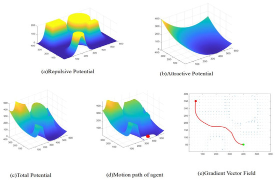 Ref. [42] use and to represent the coordinates of the agent and goal. The attractive potential field function and repulsion field function can be written as follows: