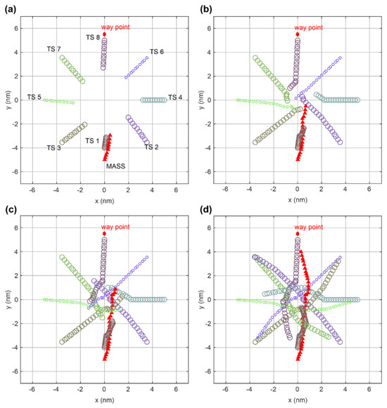 Figure 10 presents the simulation results of multi-ship collision avoidance scenarios, illustrating the dynamic process of MASS from its initial state to gradual collision avoidance and approaching the target waypoint in a multi-target ship environment, sequentially from Figure 10a–d. This set of figures dynamically validates the multi-ship collision avoidance logic of the SDVO + FIS-NC algorithm from a spatial dimension: it follows hierarchical responses to COLREGs rules (adopting different turning strategies for head-on, crossing, and overtaking scenarios); ensures safety distance by extending Velocity Obstacle (VO) with SD (avoiding near-collisions caused by excessively small safety zones in conventional VO); and quantifies risks via FIS-NC (CRI precisely controls collision avoidance timing to reduce misoperations). Ultimately, it enables the MASS to achieve safe collision avoidance and efficient route recovery in complex multi-ship scenarios.