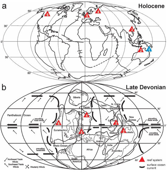 Holocene (a) and Late Devonian (b) Mollweide projections showing locations of Great Barrier Reef Province (blue triangle 1) and major Late Devonian reef provinces (red triangles): (2) Devonian Great Barrier Reef of Western Australia; (3) South China; (4) NE Laurussia—Russian platform, from Timan-Pechora to the pre-Caspian of Kazakhstan; (5) SE Laurentia—Belgium and (6) Alberta, Canada. Base maps provided by Markes Johnson and (b) modified from [92].