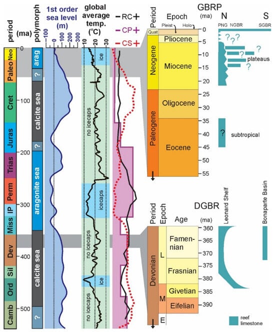 Stratigraphic distribution of the Great Barrier Reef Province and the Devonian Great Barrier Reef. Calcite–aragonite seas modified from [93], there after [94]. Sea level from [95]; global average temperature and ice caps versus no ice caps from [96]; reef cement (RC) from [97]; cement potential (CP) from [98]; modeled calcite saturation (CS) from [99]; geological time [100].