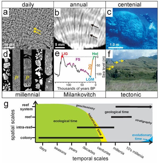 Temporal scales of processes preserved by corals and coral reefs. (a) Scanning electron photomicrograph of Porites coral showing daily growth increments in aragonite skeleton (yellow arrows), Heron Reef, Great Barrier Reef (GBR); (b) computed tomography (CT) X-ray scan slice, Porites coral showing annual density bands (black arrows), Heron Reef, GBR; (c) massive Porites colony, Heron Reef, GBR—such massive colonies record continuous decadal to centennial records of coral growth; (d) CT scan slice of core box showing Porites (P) in mid-Holocene reef core, Heron Reef, GBR—older recovered corals aid reconstruction of records over thousands of years; (e) representative sea level curve that highlights the upper limits of vertical coral reef growth through the Holocene (Hol), Deglacial (DG), Last Glacial Maximum (LGM), falling stage (FS) and Last Interglacial (LIG)—modern reefs are constrained by sea level fluctuations associated with Milankovitch scale (20–400 ka) climate cycles; (f) tectonically uplifted Pleistocene reef terraces (yellow arrows), Huon Peninsula, Papua New Guinea—sea level and climate constraints make coral reefs useful recorders of global change over very long tectonic scales of 10 s to 100 s of millions of years; (g) schematic diagram showing time frames over which ecological, historical, geological and evolutionary processes operate on reefs relative to spatial and temporal scales.