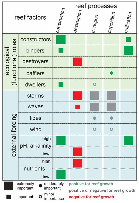 Carbonate factories have three key ecological functions in producing a reef and these roles can be mapped to ecological or community structures using the functional ‘guilds’ of Fagerstrom [31,32,33] (Figure 4 and Figure 5). Notwithstanding that the term guild also has different meanings and contexts for different users, a functional approach is particularly useful for comparing reefs of different ages. However, it is important to distinguish the broader reef ‘construction process’ outlined above, from the functional ‘constructor guild’ [31] (Figure 4 and Figure 5). The constructor guild includes members of the carbonate factory that create calcium carbonate in growth position, thus initiating framework development where they remain preserved in growth position (e.g., modern corals on the margin: upper reef slope, crest or rim). The construction process, on the other hand, includes all quantitatively important members of the carbonate factory, whether they are preserved in growth position or not (e.g., large benthic foraminifers—LBFs). Corals dominate the constructor guild in modern reefs (i.e., they initiate most framework construction), but they also play a major role, along with other organisms, in the broader process of constructing the bulk calcium carbonate that makes up the reef edifice. Other organisms may contribute to the constructor guild, including CCA, which can be volumetrically important framework constructors in some high-energy settings [155,156], and even encrusting foraminifers, vermetid gastropods and bryozoans may play a role. Different organisms have dominated the constructor guild in previous time intervals and the nature of reef growth and substrate depend significantly on the types of organisms in that role. As members of the constructor guild, many scleractinian corals have significant size and relief above the seafloor and thus enhance vertical growth (which leads to reef accretion). Such morphology is termed suprastral [157] as the constructors rise ‘above’ the sea floor stratum (Figure 6). Other organisms, such as CCA, some corals and sponges in the past, typically grew as thinner crusts on and parallel to the substrate, thus being termed constratal—‘with’ the sea floor stratum [157]. The ability to build vertical relief above the sea floor is in part a function of these constructor morphologies along with their growth and unification rates relative to ambient energy levels.