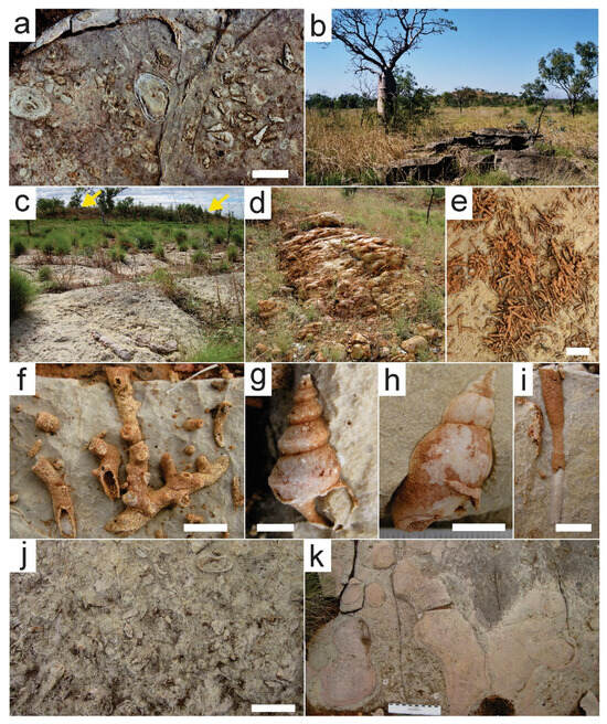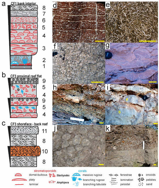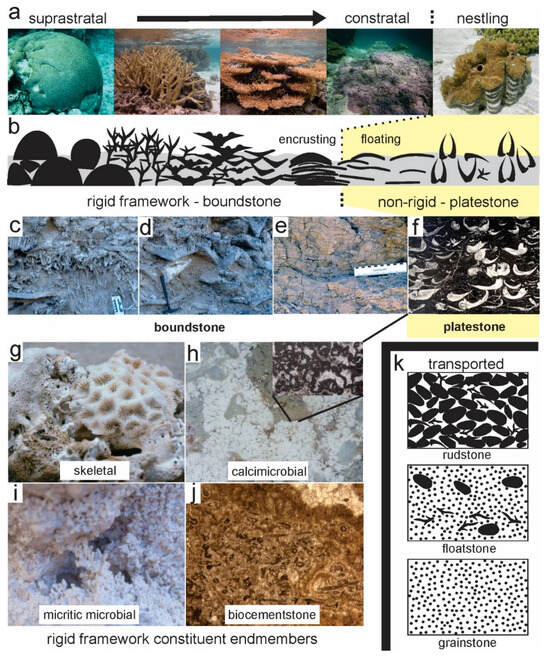 Reef-building organisms, substrate relationships and terminology for framework facies and common reef rock types. (a) Modern reef builders classified using the scheme of [157] wherein skeletons projecting above the sediment are suprastratal whereas skeletons growing along the substrate are constratal; skeletons sitting on the sediment or partly buried are nestlers; (b) silhouette showing growth morphologies in (a) reef rock; (c–f) reef–bioherm rock types; (c,d) Holocene suprastratal coral frameworks, uplifted reef terrace, Huon Peninsula, PNG; (e) Late Devonian constratal stromatoporoid sponge framework, Leonard Shelf, W.A.; (f) Middle Devonian megalodontid bivalve platestone (shells nestling in or laying on loose sediment), Chillagoe Limestone, Queensland); (g–j) four key components of reef framework from [158]; (g) Skeletal framework of self-encrusting scleractinian corals, Heron Reef, southern GBR; (h) Renalcis calcimicrobial framework, Late Devonian, Leonard Shelf, W.A.; (i) micritic microbialite framework (cryptic), Heron Reef, southern GBR; (j) biocementstone framework consisting of early marine cement (brown color) on delicate fenestrate bryozoans, Mississippian, Muleshoe Mound, New Mexico, U.S.A.; (k) silhouettes of common rock types made from transported reef sediments, rudstone is composed of coarse reef rubble, floatstone equates to coarse rubble floating in sand, grainstone is composed of sand [159,160].
