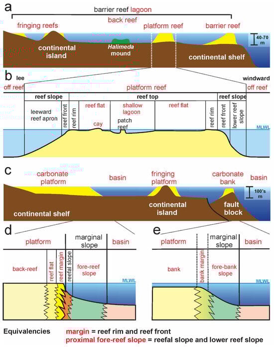 Reef zonation terminology. (a,b) Terminology for the Great Barrier Reef; (b) modified from [176]; (c–e) terminology for the Devonian Great Barrier Reef (d,e) modified from [177]. Terminology in red is adopted for this paper.