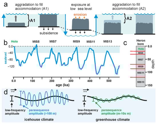Over long time frames, major cyclic changes in accommodation are caused by Milankovitch forcing of continental ice volumes, and thus eustatic sea levels, and these changes dominate reef behavior over scales of 10s to 100s of thousands of years [184]. During icehouse climates, such as today, large changes in ice volume at the poles create high-amplitude (~100 m+) changes in sea level that have resulted in a ‘layer cake’ stacking of reefs in regions with adequate ongoing subsidence, like the GBRP (Figure 8). Where there is little or no subsidence, the reefs are ‘stacked’ laterally between each glacial cycle. In southern Florida, for example, little to no recent subsidence has led to Holocene reefs growing laterally, seaward of the Last Interglacial (LIG) maximum sea level Marine Isotope Stage (MIS) 5e reef on older reefs that tracked lowering sea levels into the glacial maximum (substages 5a–c) [185,186]. The MIS 5e LIG reef currently is exposed above modern sea level to form the Florida Keys because LIG sea level was higher than today [187,188]. However, in times of greenhouse climate, sea level fluctuation has much smaller amplitude (m to 10 s of m) as there is less continental ice storage [183]. These lower-amplitude changes in sea level create less accommodation, so thinner layers result. These externally forced, high-frequency (in geological time) cycles dominate the stratigraphy of most ancient carbonate platforms and are called parasequences and their amplitudes vary between icehouse and greenhouse climates [189]. As renewed reef growth seeks to fill newly created accommodation with each new sea level rise, each parasequence generally shows a shallowing-up trend as the reef community grows up to, or progrades over deeper deposits at, the newly established maximum sea level.