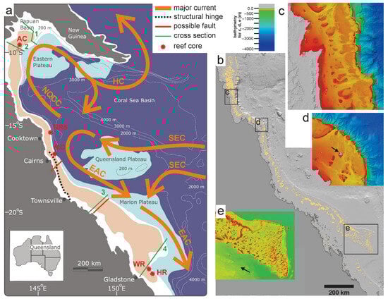 (a) Map of the Great Barrier Reef Province showing the main zone occupied by reefs (pink) [181], major current systems (South Equatorial Current: SEC, East Australian Current: EAC, North Queensland Coastal Current: NQCC, Hiri Current: HC), structural hinge with deepening to the east [190], positions of possible reactivated transform faults (red) that isolate the more rapidly subsiding central zone of the reef [194], positions of cross-sections (green) shown in a subsequent figure, and positions of deep reef cores: Anchor Cay—AC, Ribbon Reef 5—RR5, Michaelmas Cay—MC, Wreck Reef—WR, and Heron Reef—HR. (b) Map showing Late Pleistocene platforms and reefs (light orange) with positions of insets (c–e) shown; (c–e) bathymetry [195]; (c) ribbon reefs with narrow shelf; (d) shelf area with Lizard Island (arrow), a mid-shelf continental island complex with fringing and barrier reefs surrounding a shallow lagoon; (e) Swains Reefs separated from the continent by the Capricorn Channel (arrow).