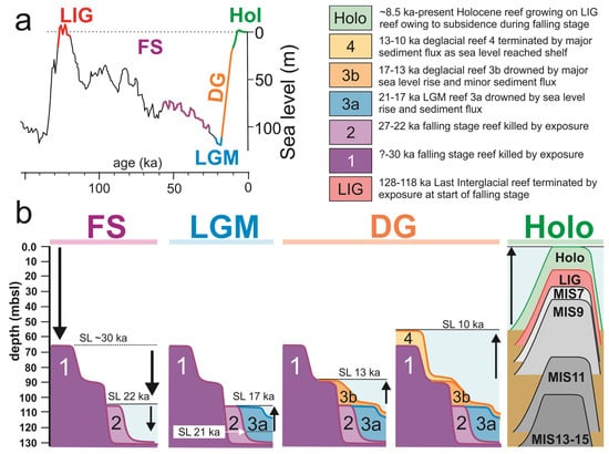 History of the modern Great Barrier Reef. (a) Sea level curve showing times of reef growth in the Great Barrier Reef: Holocene (Hol), Deglacial (DG), Last Glacial Maximum (LGM), Falling stage (FS) and Last Interglacial (LIG). (b) Sequence of reef growth since the LIG in relation to sea level change, modified from [46]; Holocene stacked reef section is based on the Ribbon Reef 5 core, depths and interpreted packages from [182].